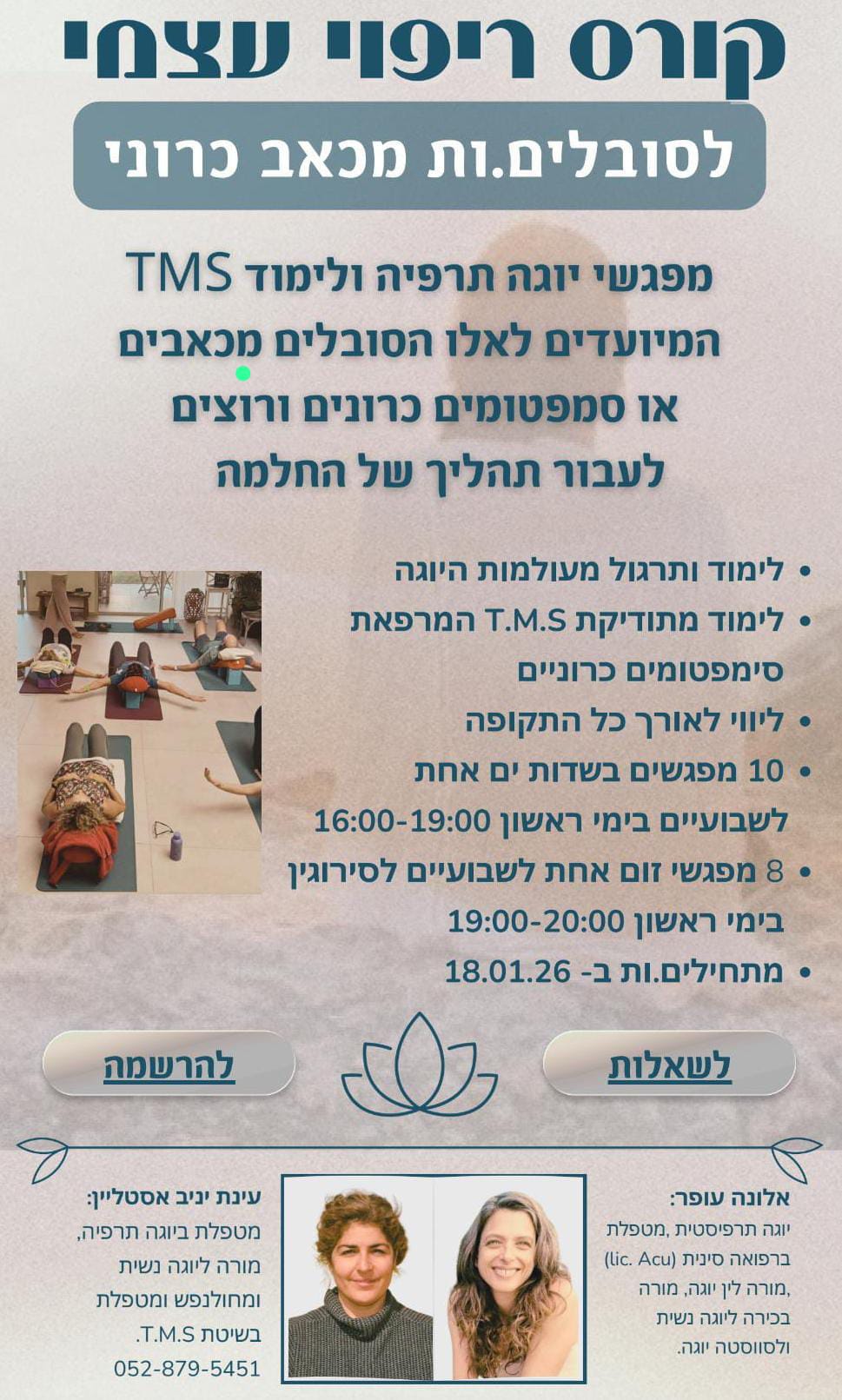 קורס ריפוי עצמי, לסובלים.ות מכאב כרוני. לימוד ותרגול מעולמות היוגה בשילוב עם שיטת TMS המרפאת סמפטומים כרונים. החל מה- 18.1.26 נקיים 10 מפגשים בשדות ים אחת לשבועיים 16:00-19:00. ו- 8 מפגשי זום אחת לשבועיים לסרוגין 19:00-20:00.