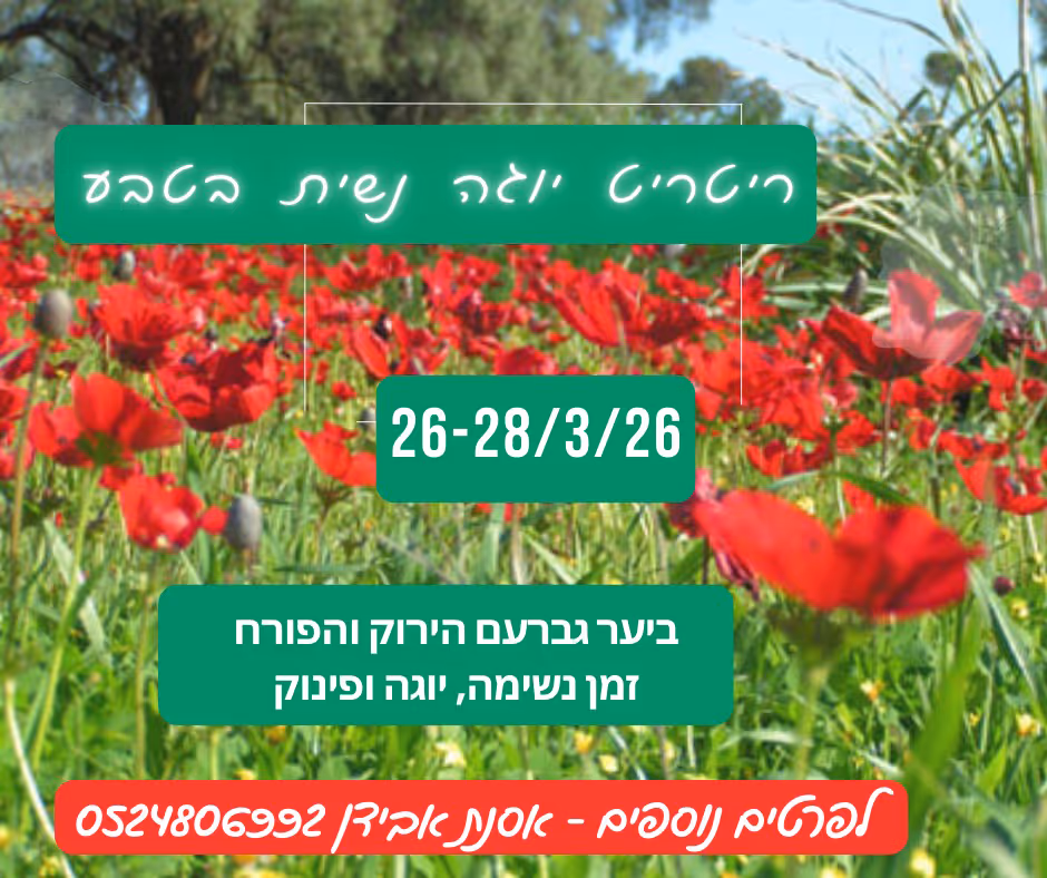 הצטרפי אלי לסדנת יוגה נשית קסומה ביער גברעם, בה נחקור את הקשר בין מרחב האגן לביטוי האישי שלנו בעולם. במהלך הריטריט נשלב תרגולי יוגה, נשימות ומדיטציות, לצד הליכות נעימות בטבע, שיביאו אותנו למגע עמוק עם עצמנו ועם הסביבה. נקדיש זמן ללימוד מתוך הפילוסופיה של היוגה ולכתיבה, וניצור מרחב בטוח ואיכותי שבו נשים יכולות להתחבר, לשתף ולהתפתח יחד. בעונה המושלמת הזו, כשכל מה שסביבנו ירוק ופורח, ניצור חוויות מעצימות שילווה אותנו הלאה.