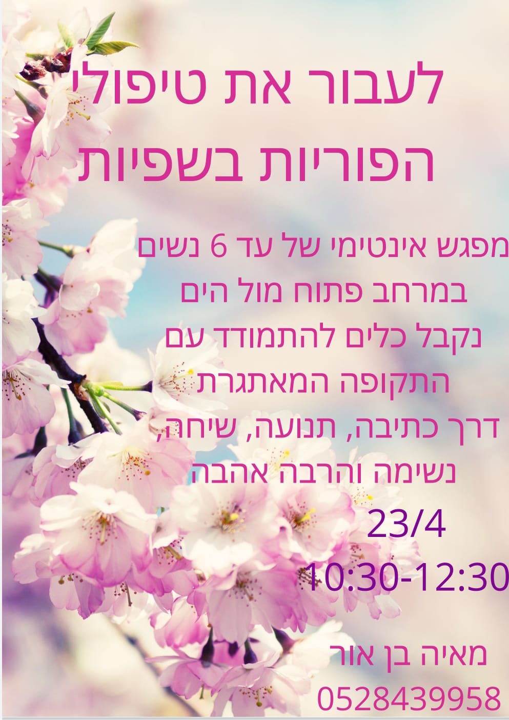 נשחרר קולות מבחוץ ונלמד איך להקשיב שוב ללב, נקבל כלים להתמודד עם התקופה המאתגרת דרך כתיבה, תנועה, שיחה ונשימה. מוזמנת להתקשר 0528439958
